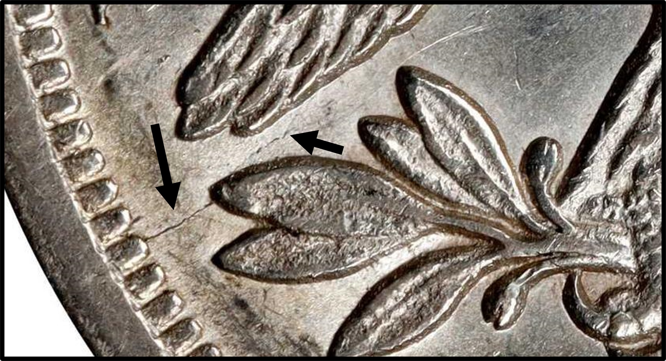 - A very fine die crack extends from the rim to the tip of the center leaf, then into the right side of the left wing.