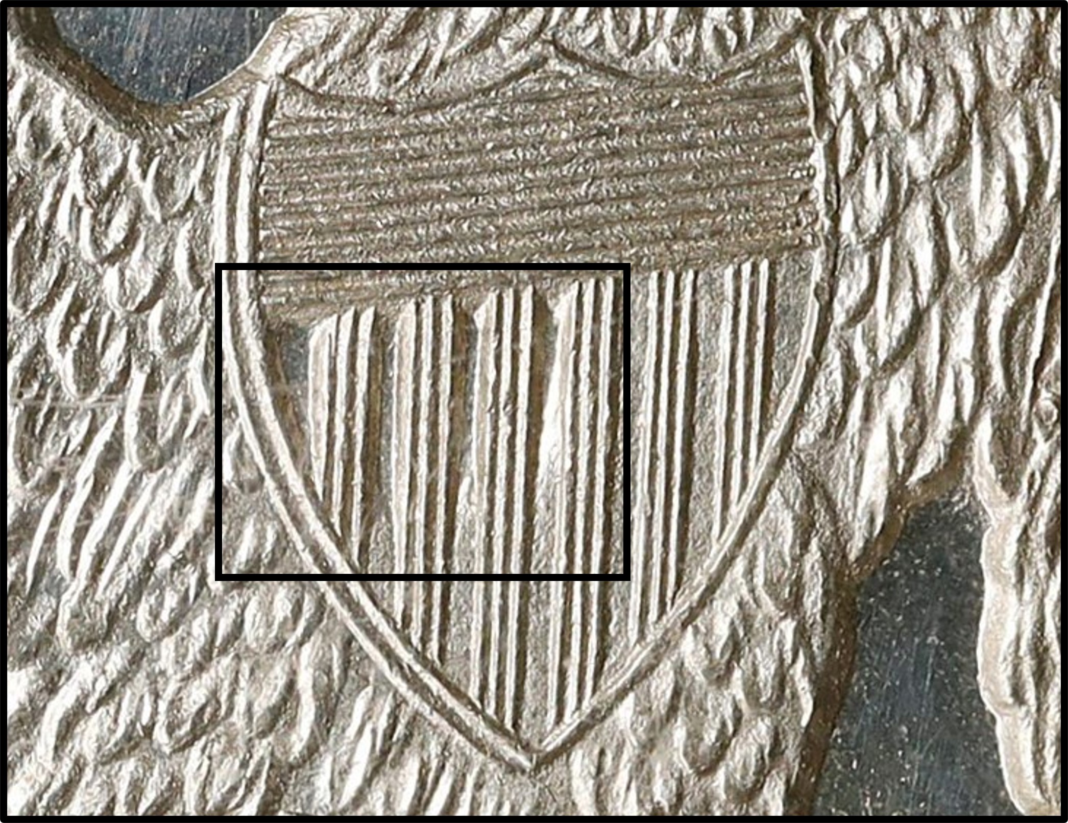Reverse B shows significant signs of die rust. The shield recesses are notably unfinished except for the