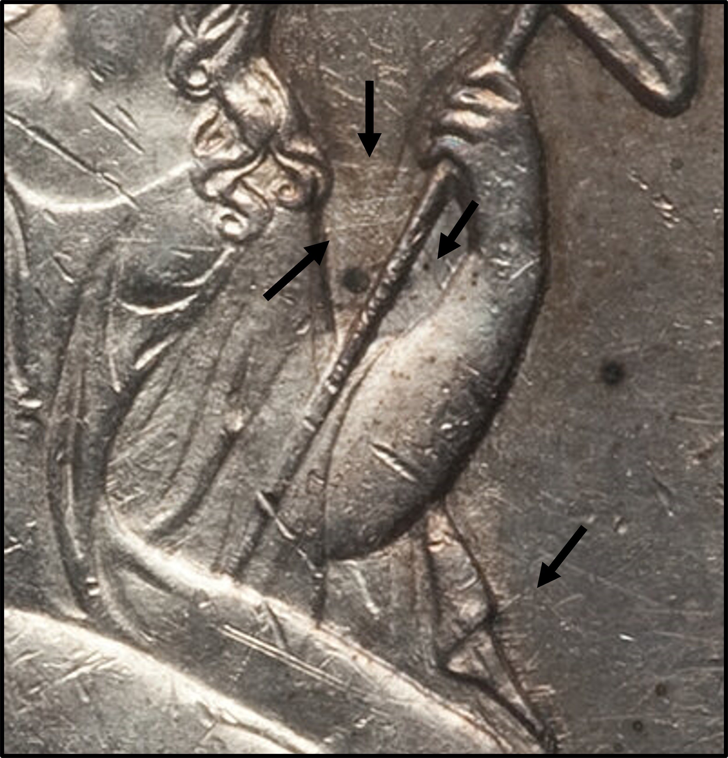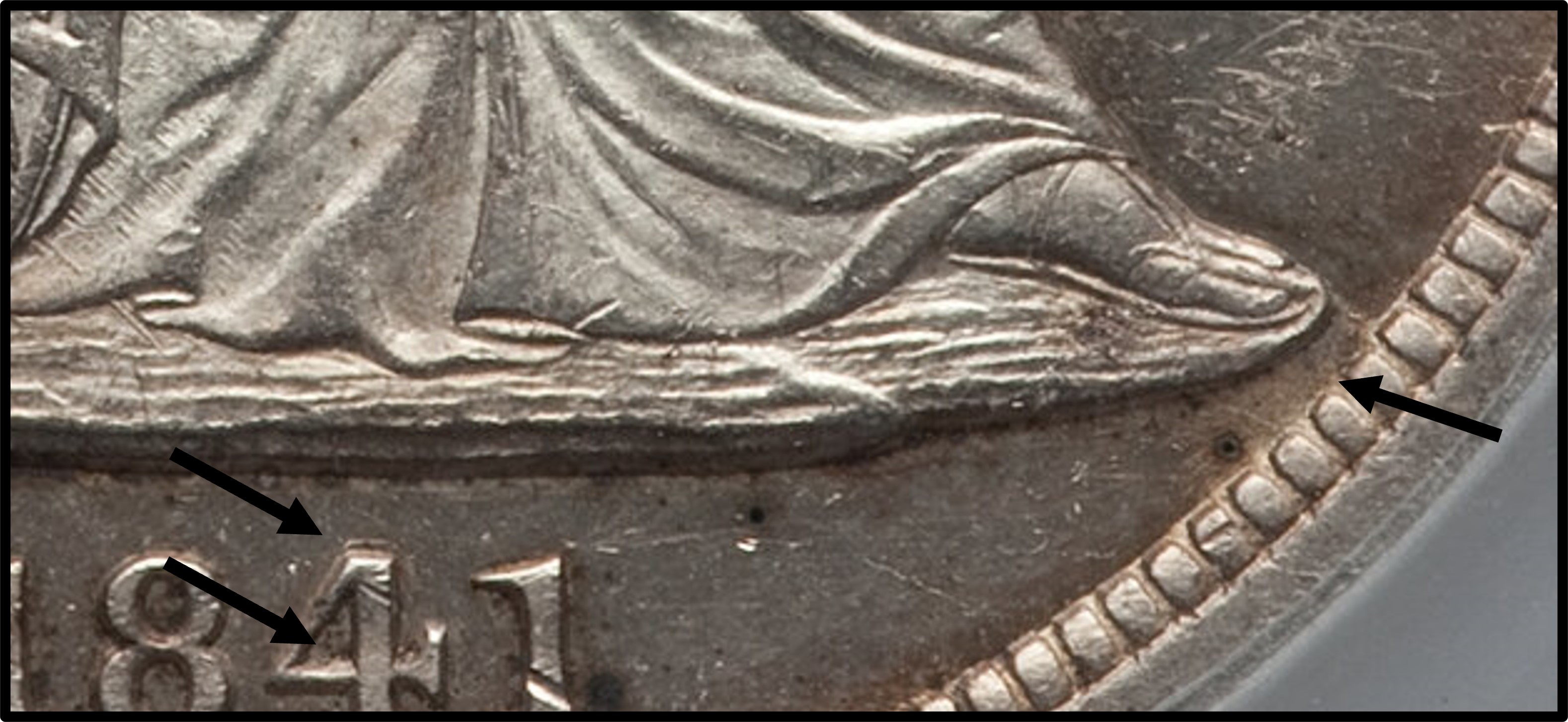 Obverse 1, date and repunched 4:  1841 PCGS AU53, from the Osburn-Cushing reference collection. Obverse 1, state a:  1841 NGC AU58+, from the Heritage archives. Obverse 1, state d:  1841 NGC MS61, from the Heritage archives. Reverse 1840 A: 1841 NGC AU55, from the Osburn-Cushing reference collection. |