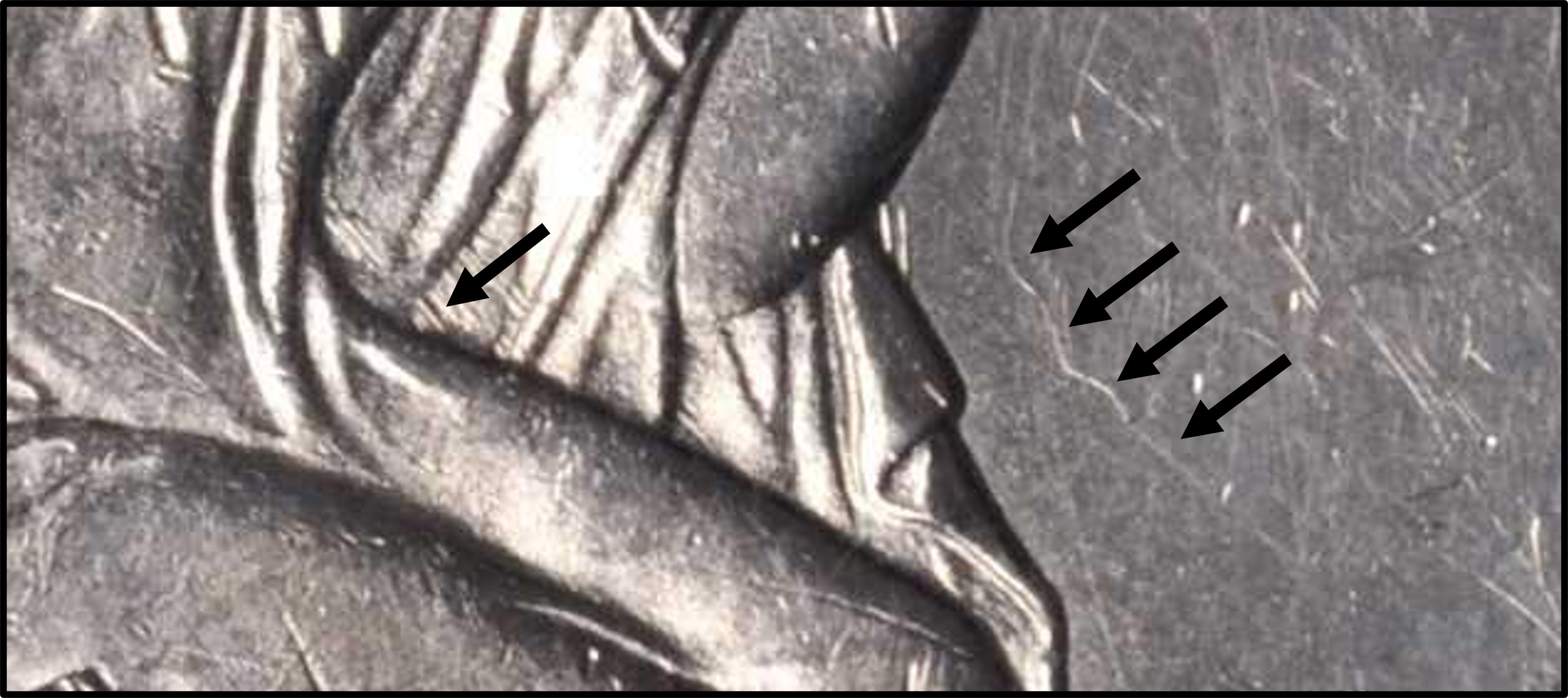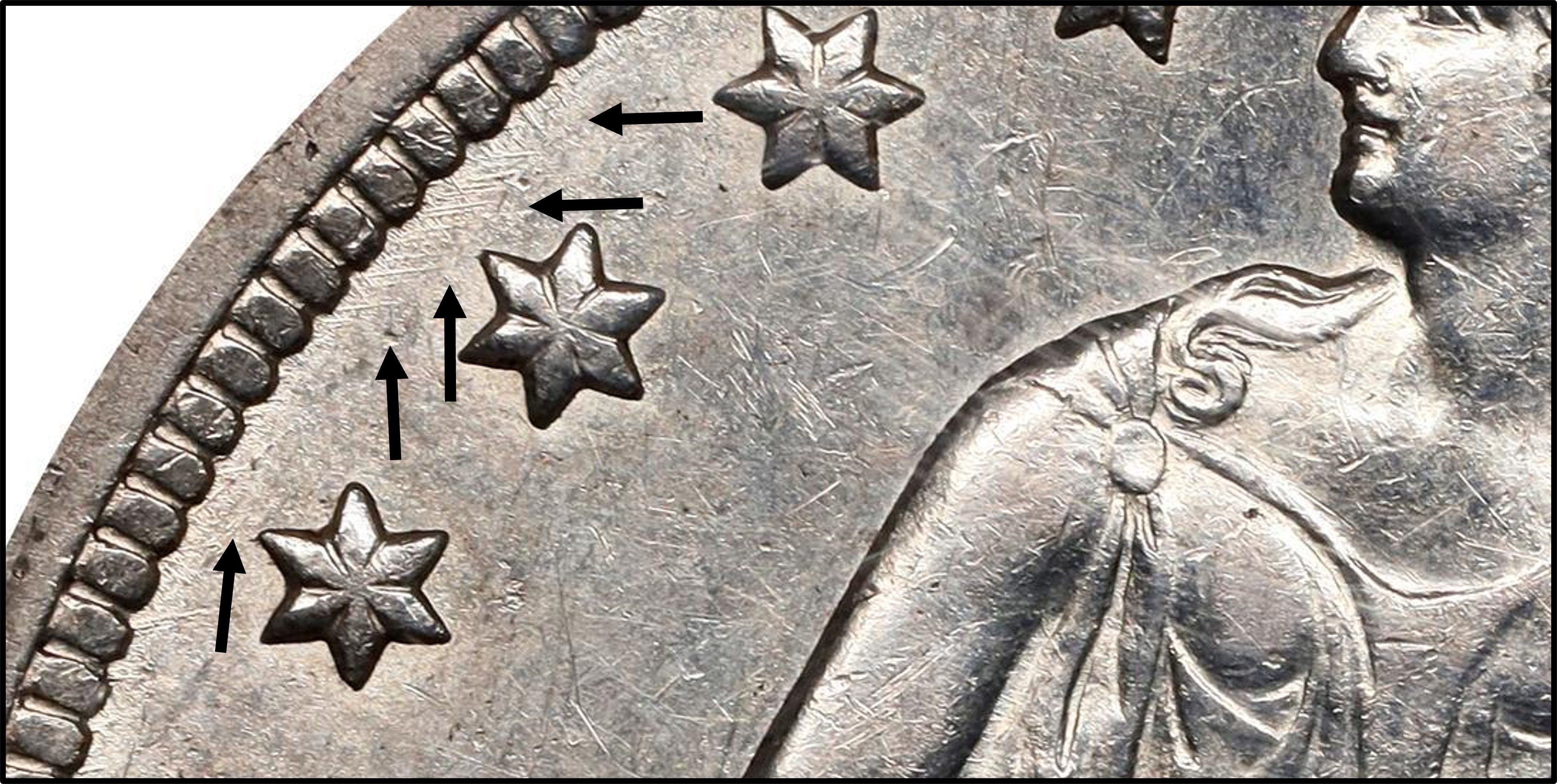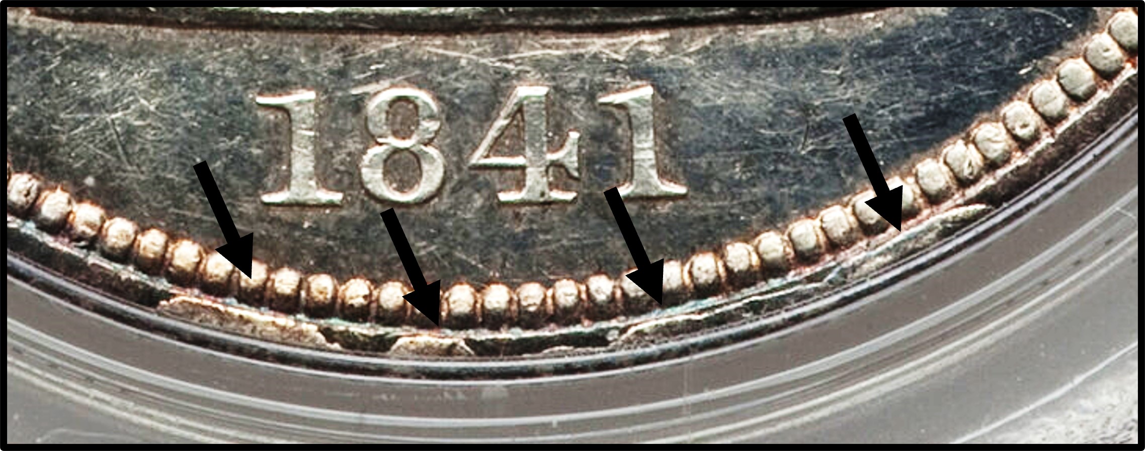 Obverse 2 and Reverse 1840 A:   1841 NGC AU55: from the Osburn-Cushing reference collection. Obverse 2, state a:   1841 PCGS Genuine AU details rims filed, from the Stacks-Bowers archives. Obverse 2, state b:   1841 PCGS AU58, from the Stacks-Bowers archives. Obverse 2, state d:   1841 PCGS AU50 OGH, from the Heritage archives. |