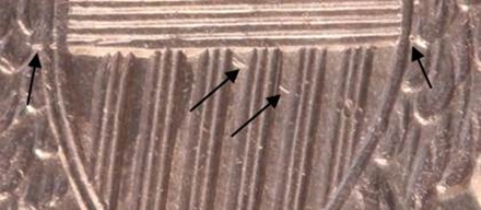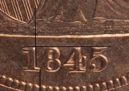 1845 Reverse A features one very notable die marker. The next photo shows the heavy die line in shield recesses 4 and 5