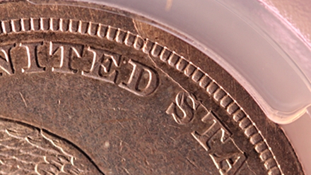 - Perfect die. Notable die lines extend from the denticles into the field under the date,