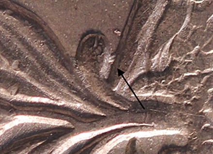 slanting up to the left from the denticles below the date, indicated by the lower arrows. The die was polished