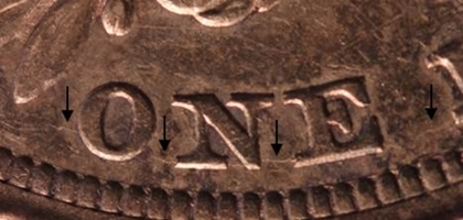 - A faint die crack crosses the base of the date. The crack is faint enough that it will seldom be visible