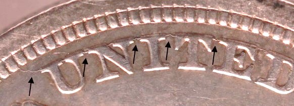 - The die crack is heavier. At this point it may be visible on lower grade coins.